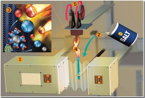 1. Một máy phát sóng radio với tần số 14 mega hec. 2. Sóng radio sẽ hoà tan muối ăn và nước. 3. Điều xảy ra kế tiếp vẫn còn là bí ẩn, tuy nhiên một giả thuyết cho rằng natri clorua có thể làm yếu liên kết giữa nguyên tử ôxi và hyđrô trong nước. Sóng âm thanh phá vỡ liên kết và giải phóng phân tử khí hyđrô dễ cháy. 4. Diêm đốt cháy hyđrô, phát sinh ngọn lửa. 5. Nhiệt sinh ra có thể cung cấp năng lượng cho một động cơ đơn giản. |