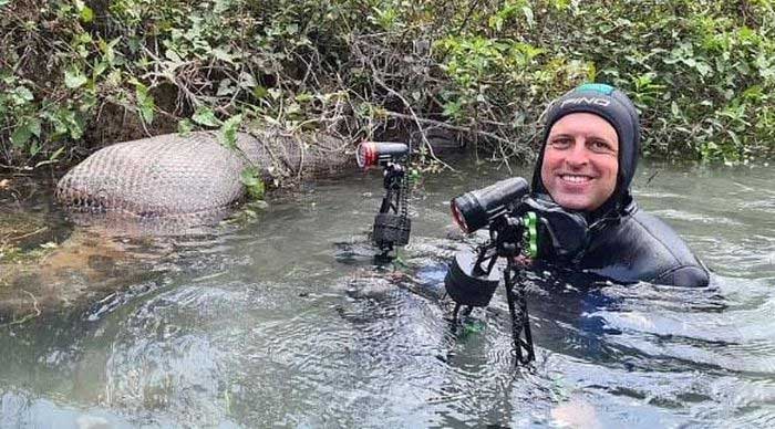 Julian Gunther lặn dưới nước hàng giờ để chụp ảnh trăn khổng lồ. (Ảnh: Daily Mail).