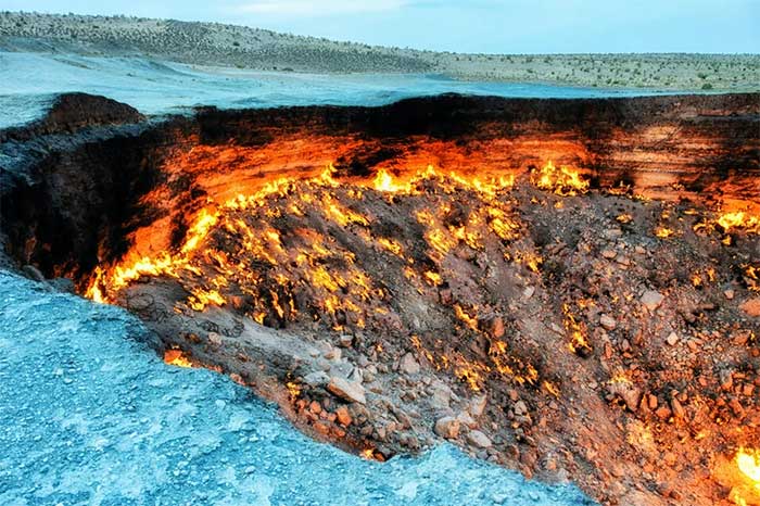 Miệng núi lửa khí tự nhiên Darvaza bí ẩn được mệnh danh là “Cổng địa ngục” nằm ở trung tâm sa mạc Karakum ở Turkmenistan. Nó được cho là được hình thành sau vụ sập giàn khoan khí đốt tự nhiên vào năm 1971, gây ra một đám cháy vẫn cháy kể từ đó.